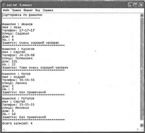 ►Листинг 5.21. Вывод содержимого записной книжки с сортировкой по фамилии